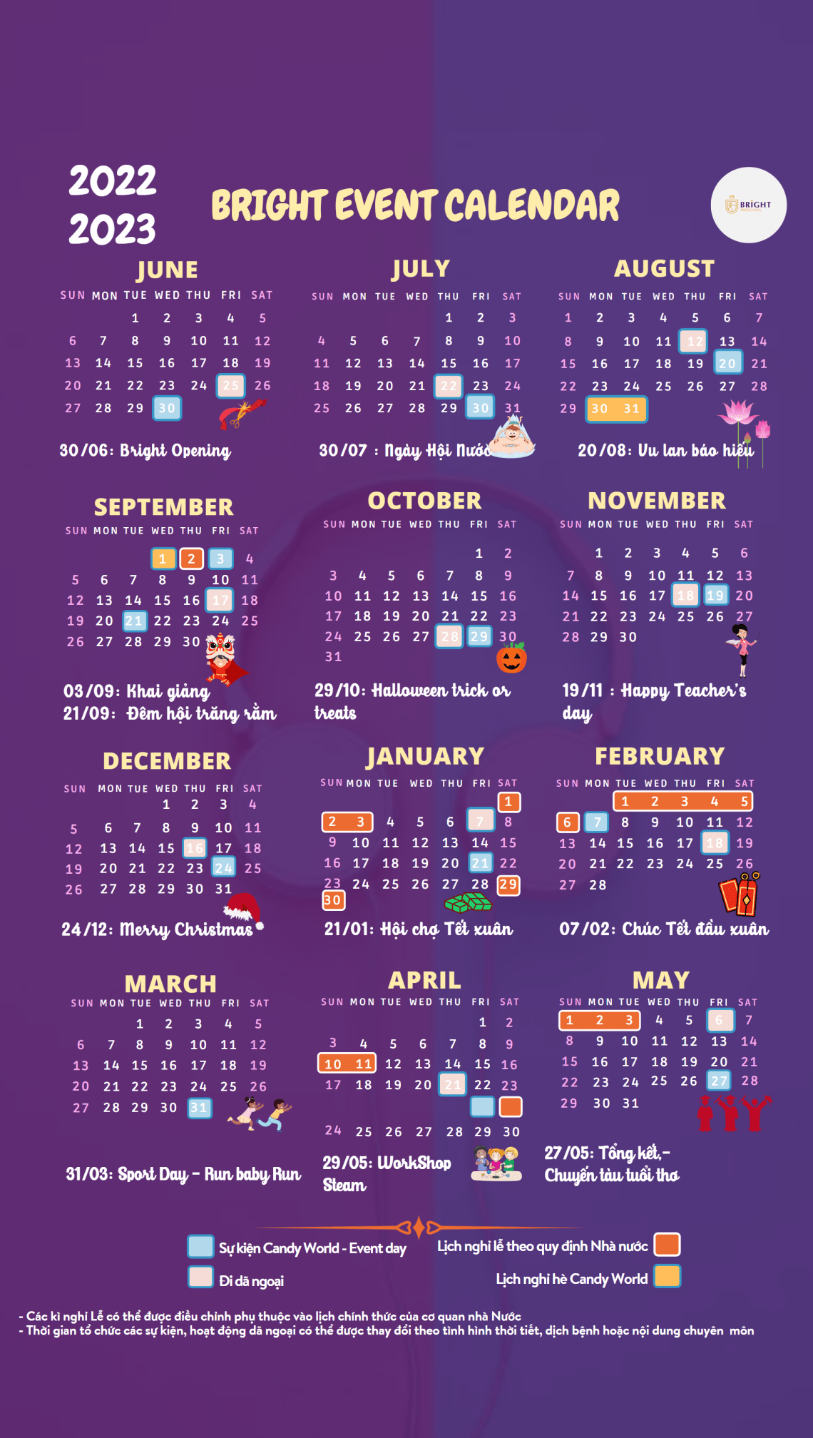 Thời gian biểu sự kiện tại mầm non Bright Preschool